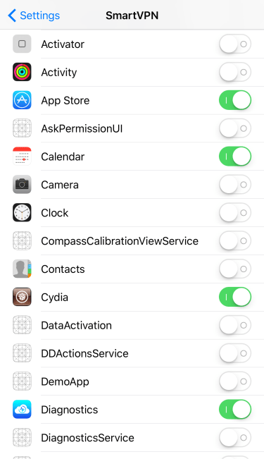As you can see, we have the App Store and Cydia Store both turned on, so whenever we launch either of those apps, SmartVPN automatically kicks on the VPN that we have installed on our iPhone: