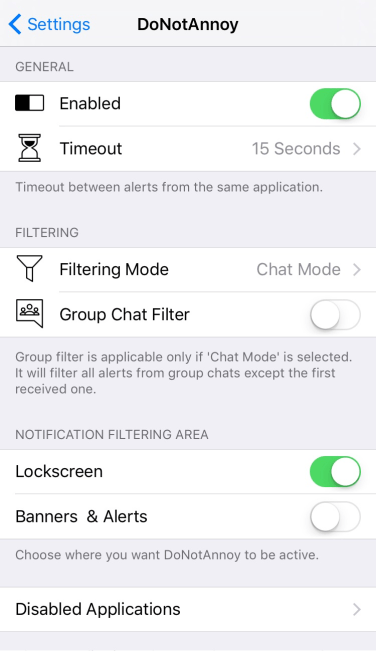 The tweak is meant to be a first line of defense before you go toggling on Do Not Disturb mode, because perhaps you still want to receive notifications from this contact before silencing them completely. Instead, DoNotAnnoy simply mutes notifications for certain time intervals in between frequent notifications from the same app.